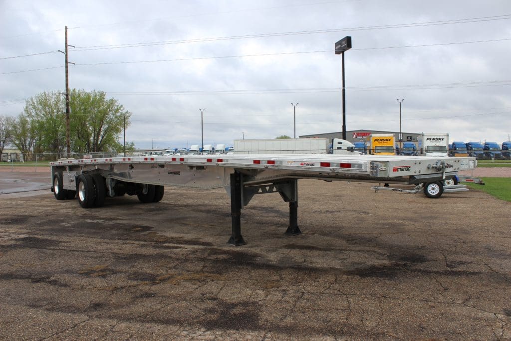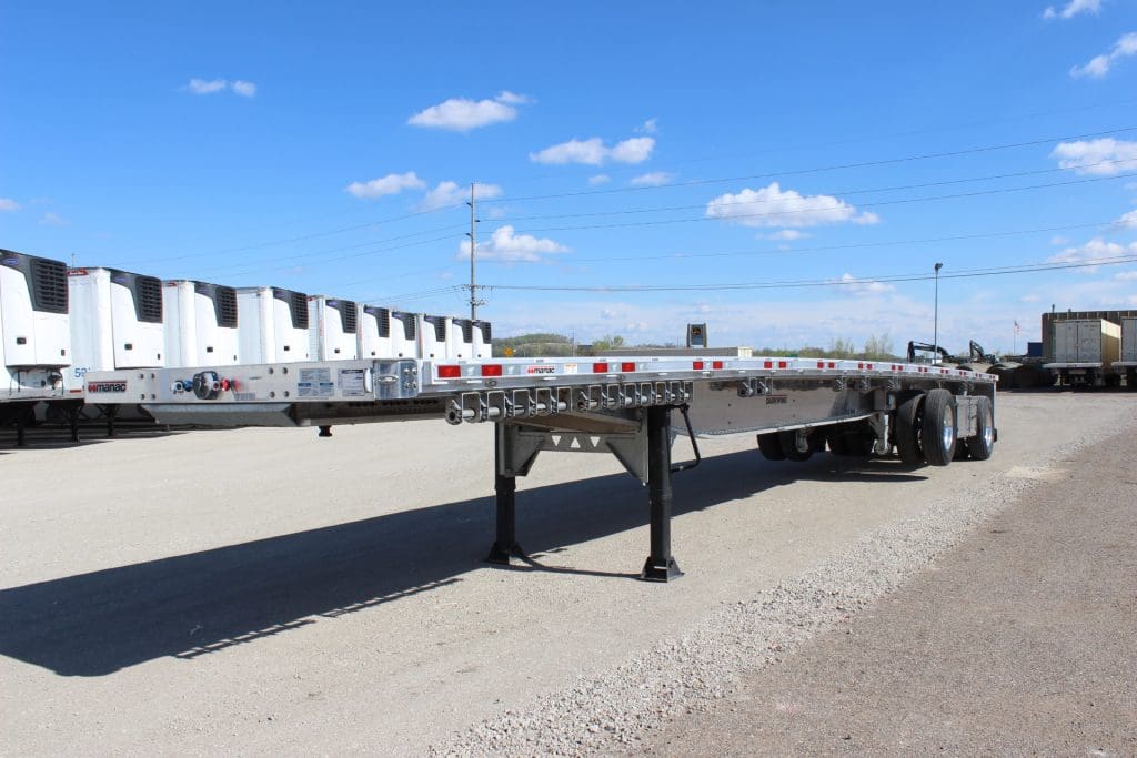 48’x102″ Aluminum flatbed, apitong floor, nail strips, sliding winch track with winches, 16″ crossmembers, coil package, 2 aluminum toolboxes, air ride suspension, spread axle with lifting front axle, disc brakes, tire inflation system, 11R22.5 aluminum disc wheels.