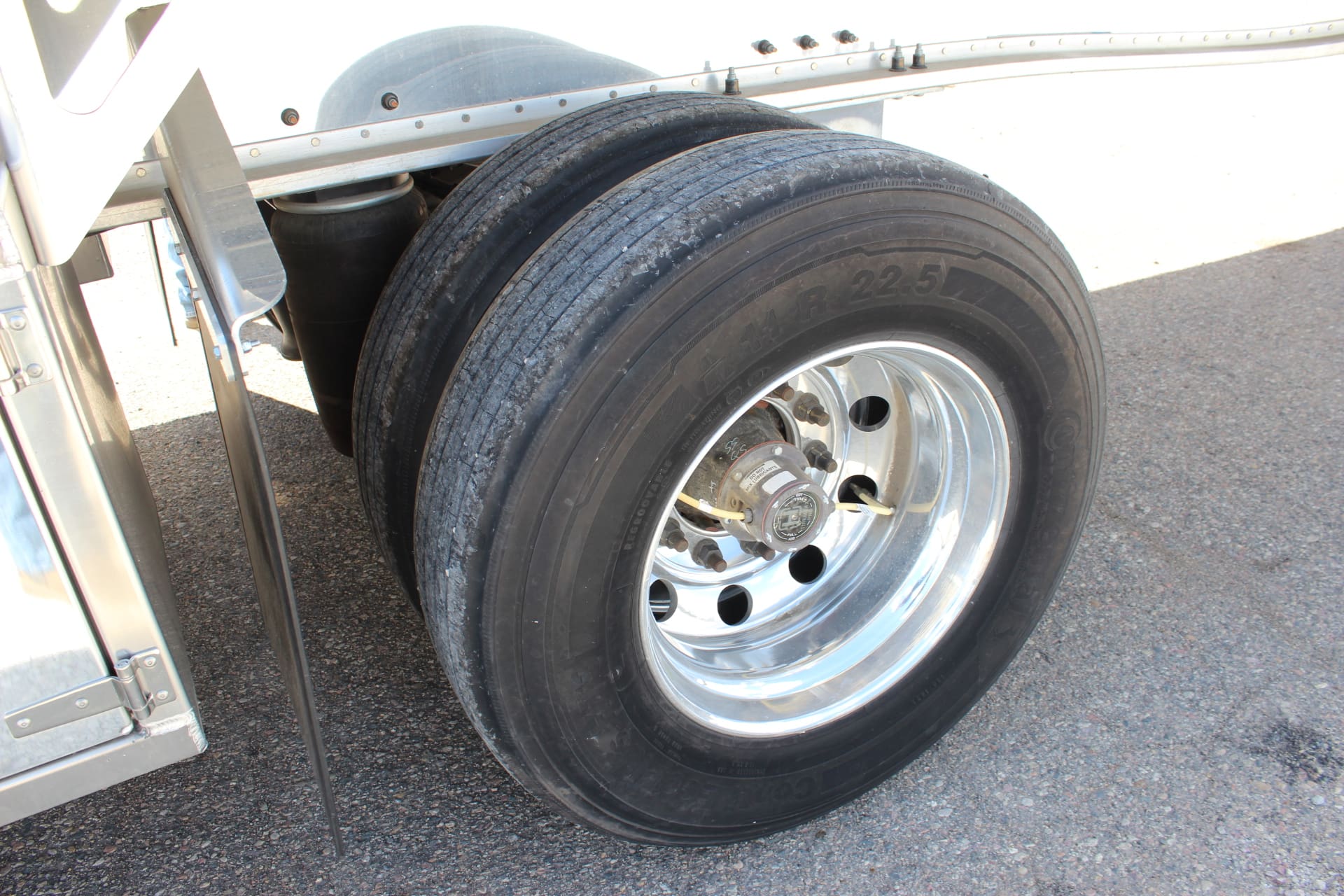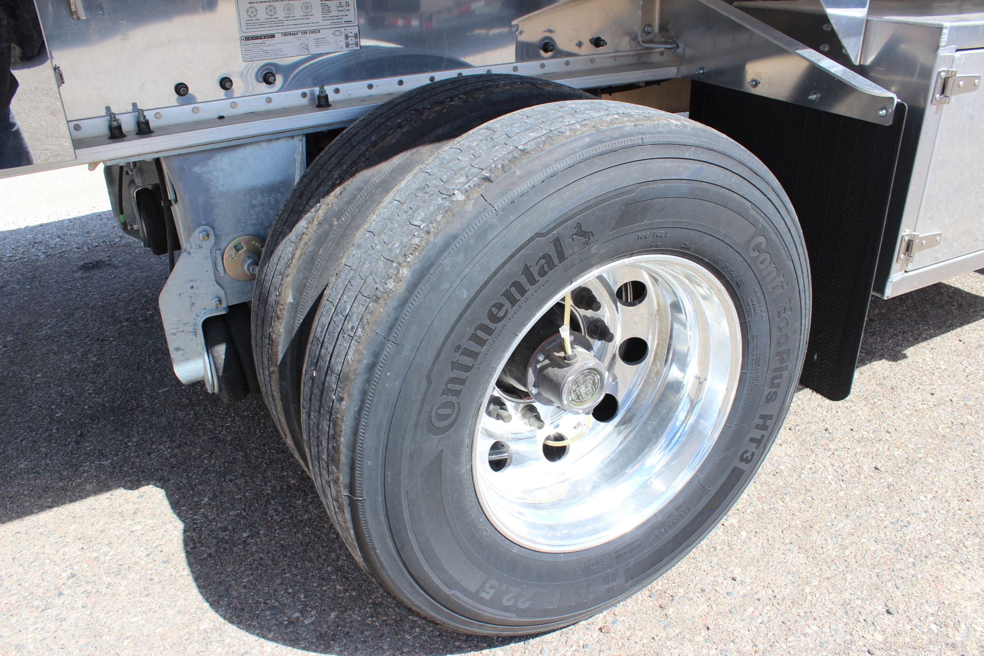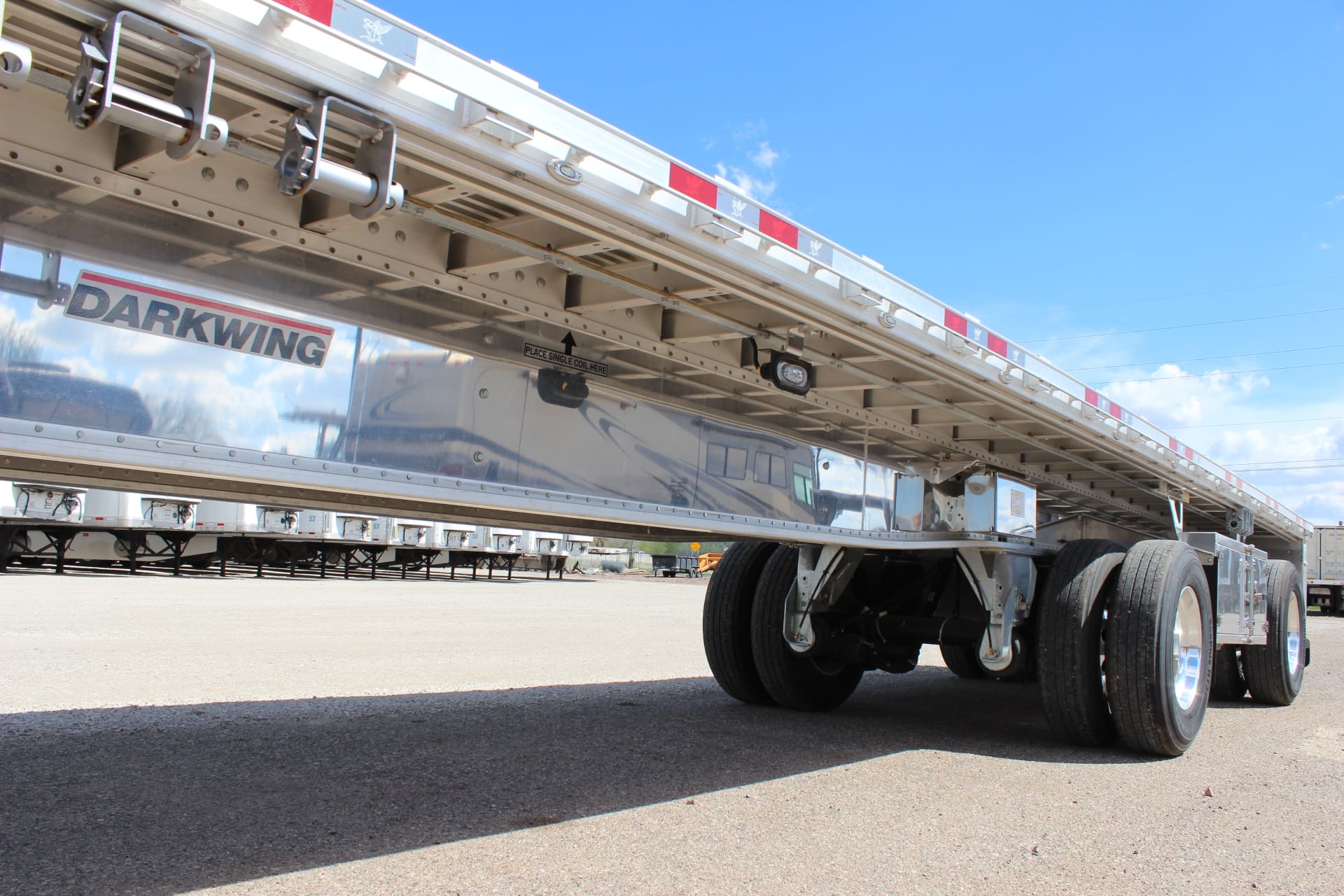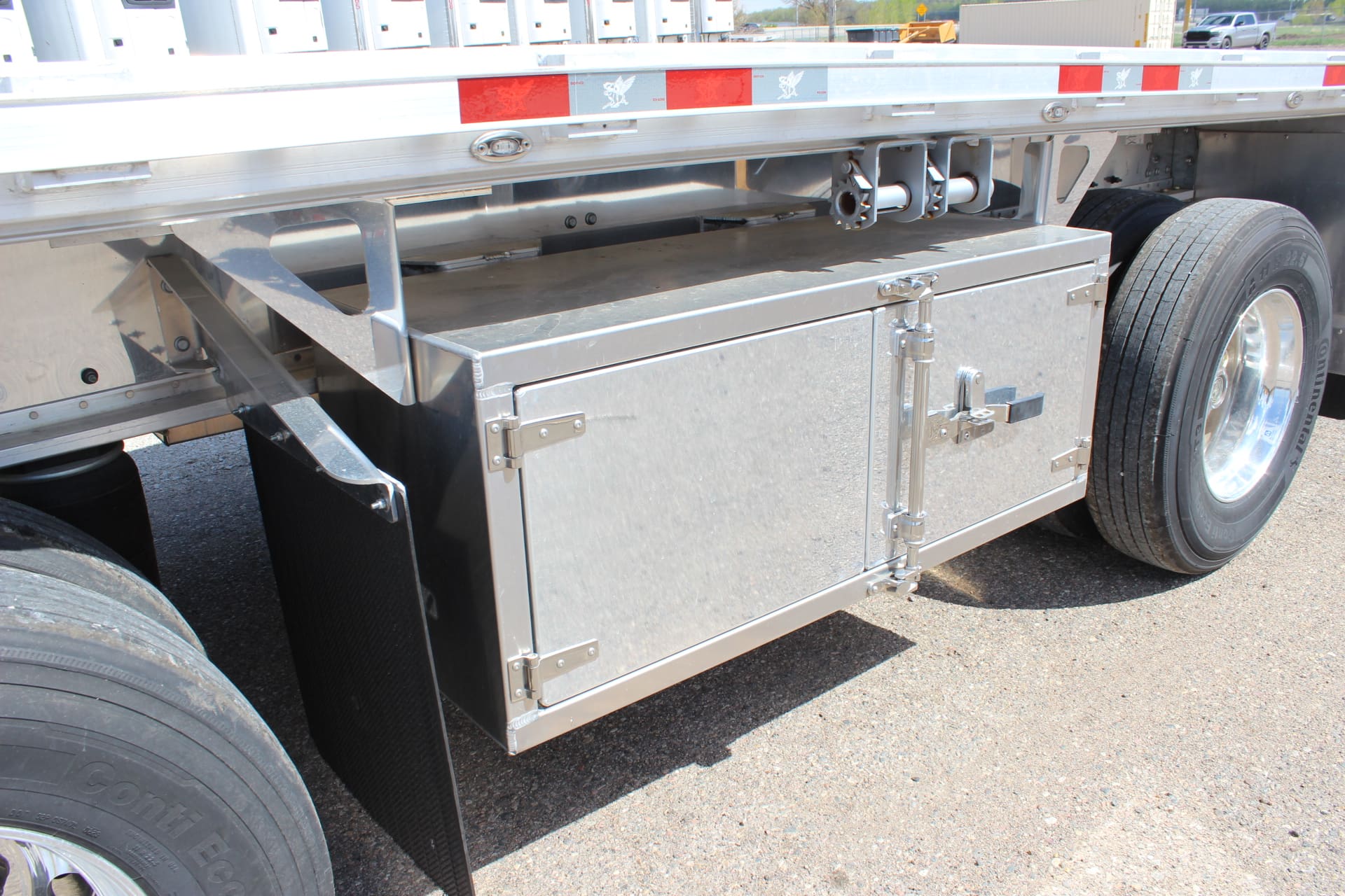 48’x102″ Aluminum flatbed, apitong floor, nail strips, sliding winch track with winches, 16″ crossmembers, coil package, 2 aluminum toolboxes, air ride suspension, spread axle with lifting front axle, disc brakes, tire inflation system, 11R22.5 aluminum disc wheels.
