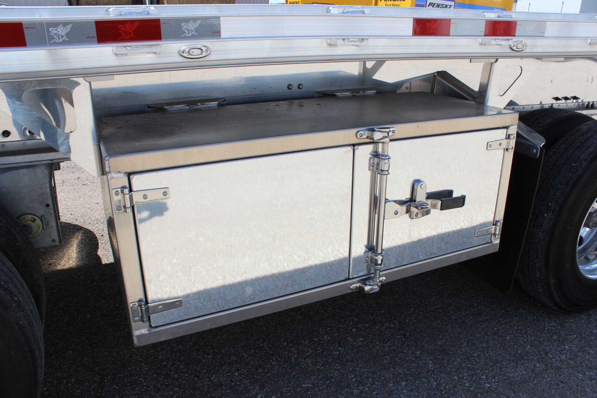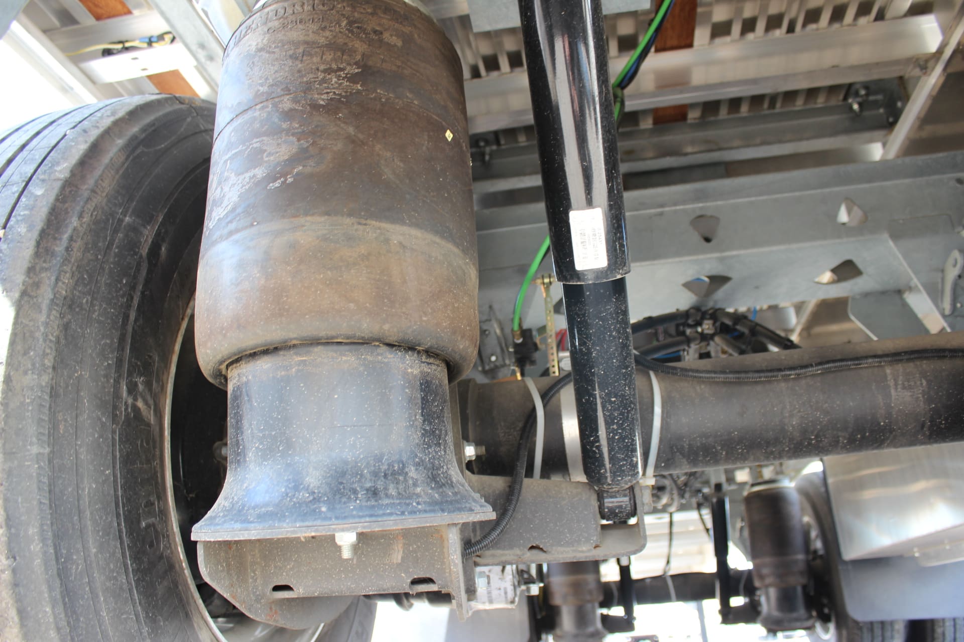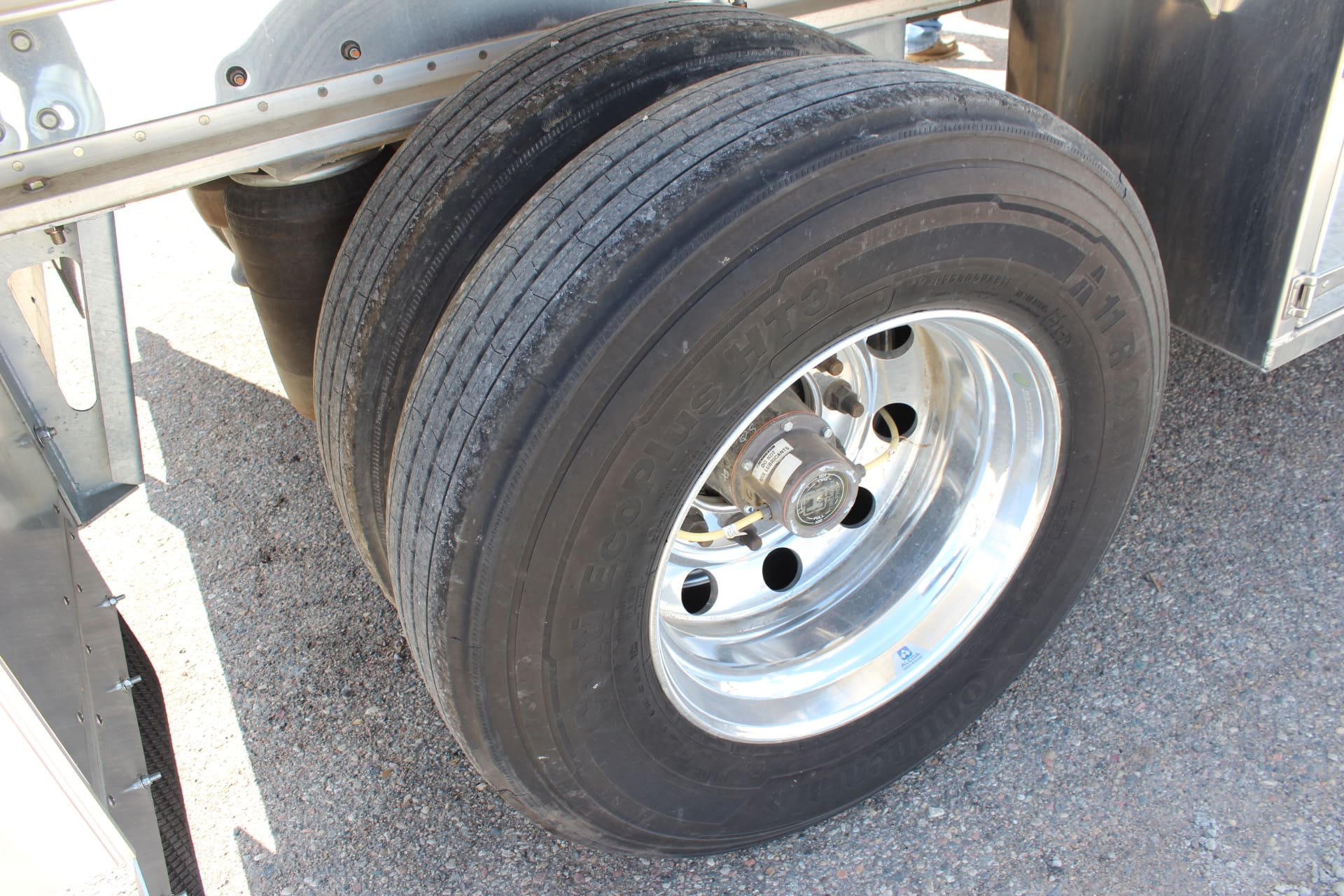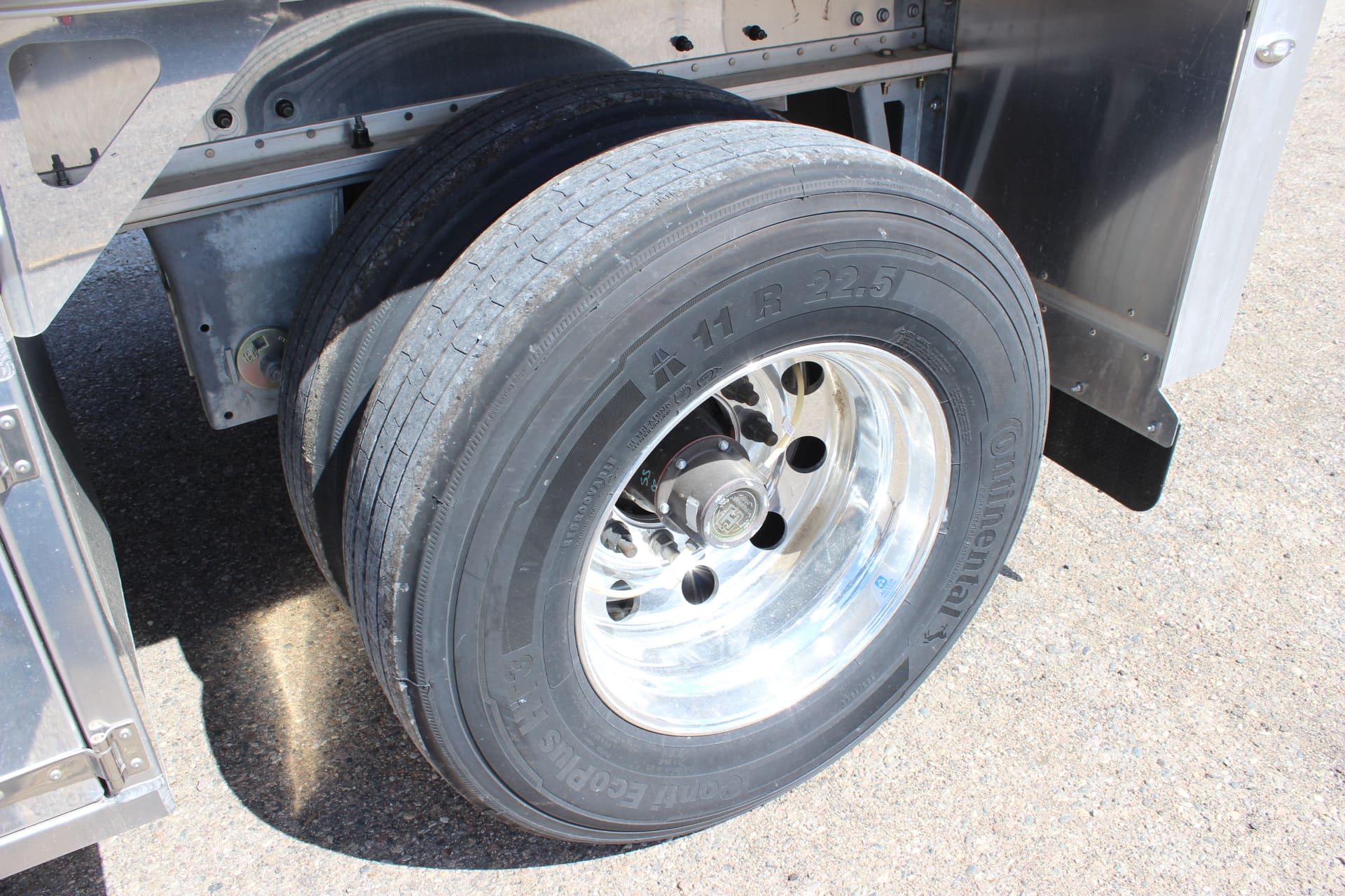 48’x102″ Aluminum flatbed, apitong floor, nail strips, sliding winch track with winches, 16″ crossmembers, coil package, 2 aluminum toolboxes, air ride suspension, spread axle with lifting front axle, disc brakes, tire inflation system, 11R22.5 aluminum disc wheels.