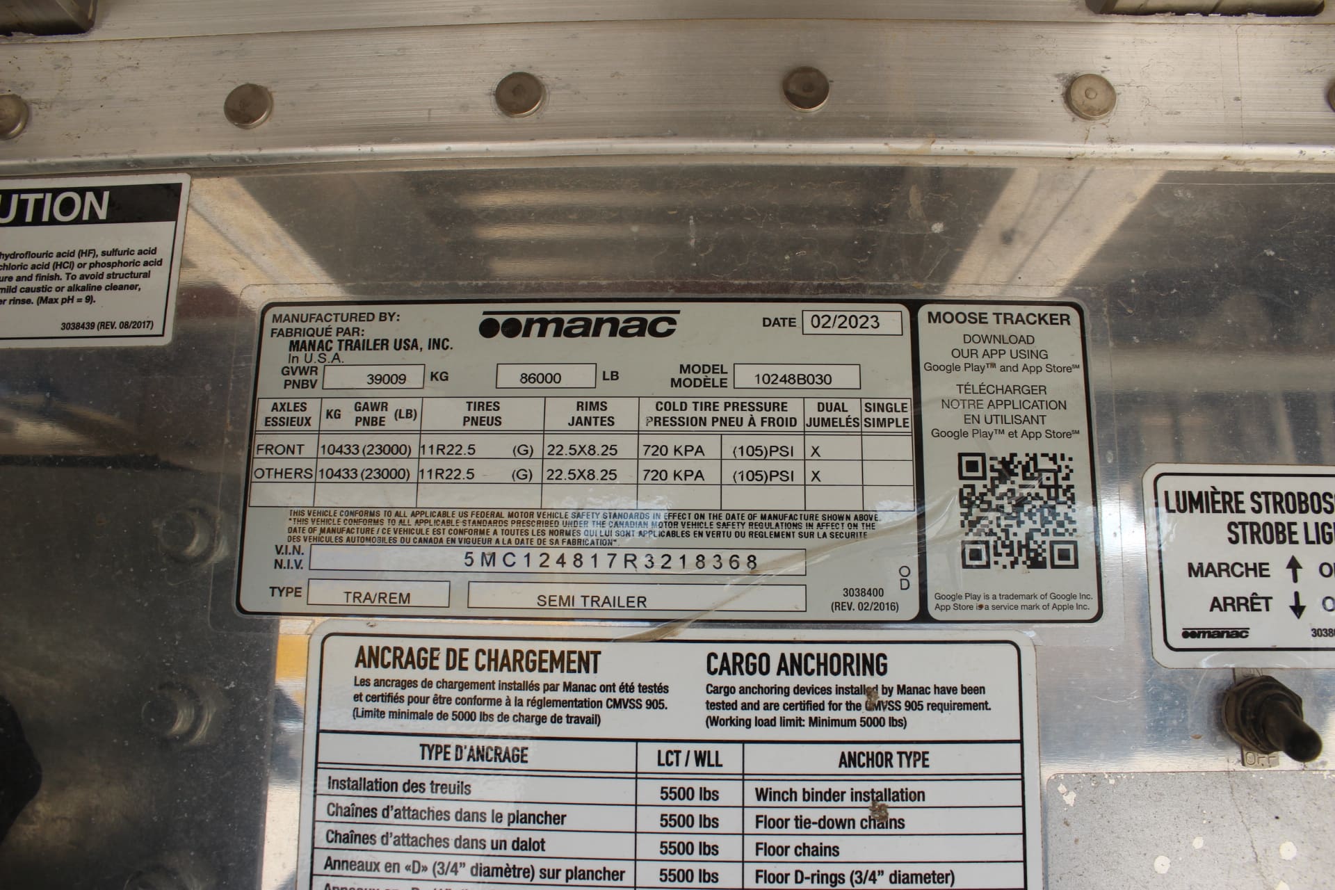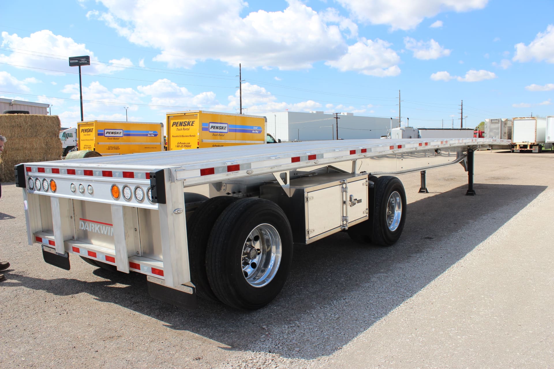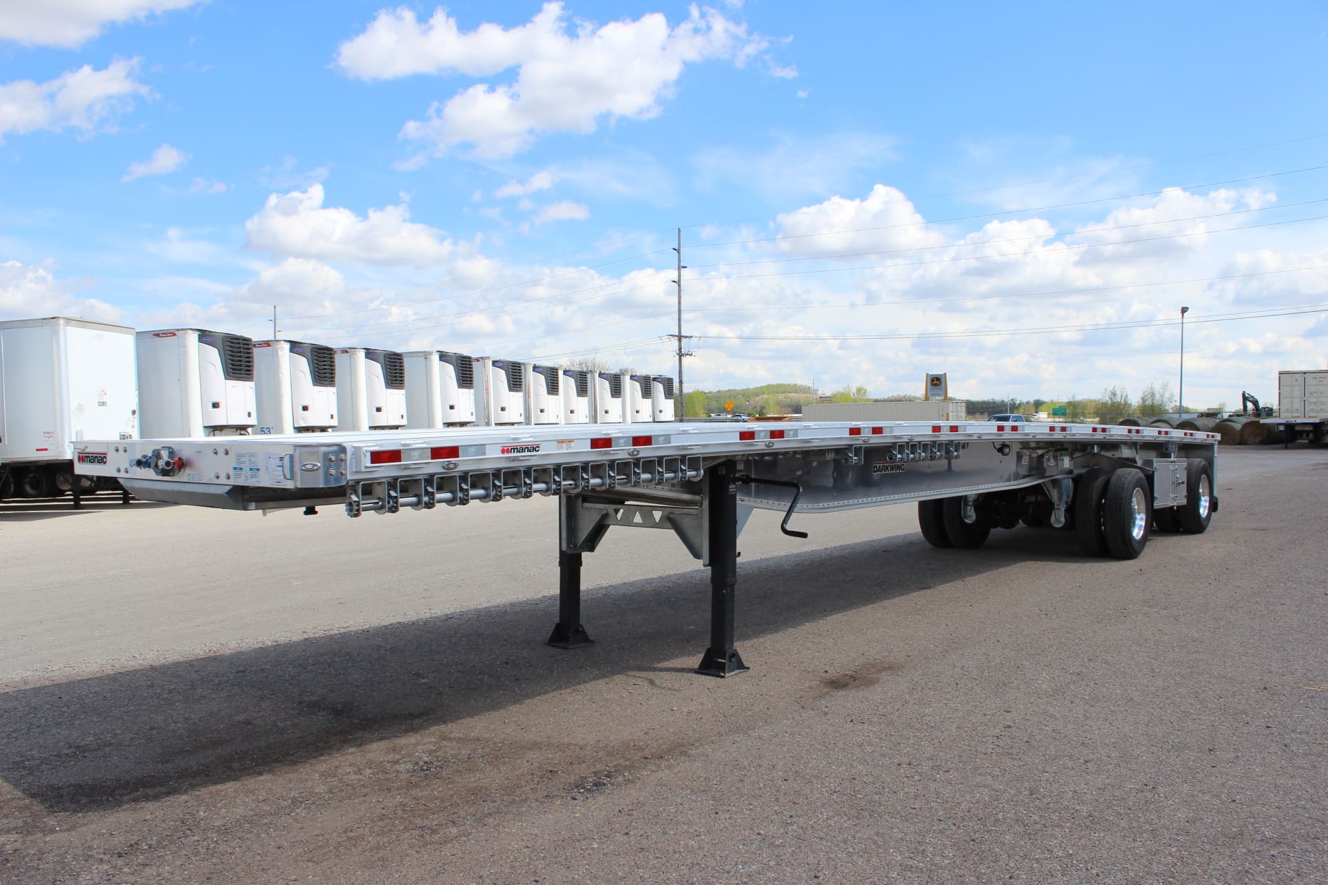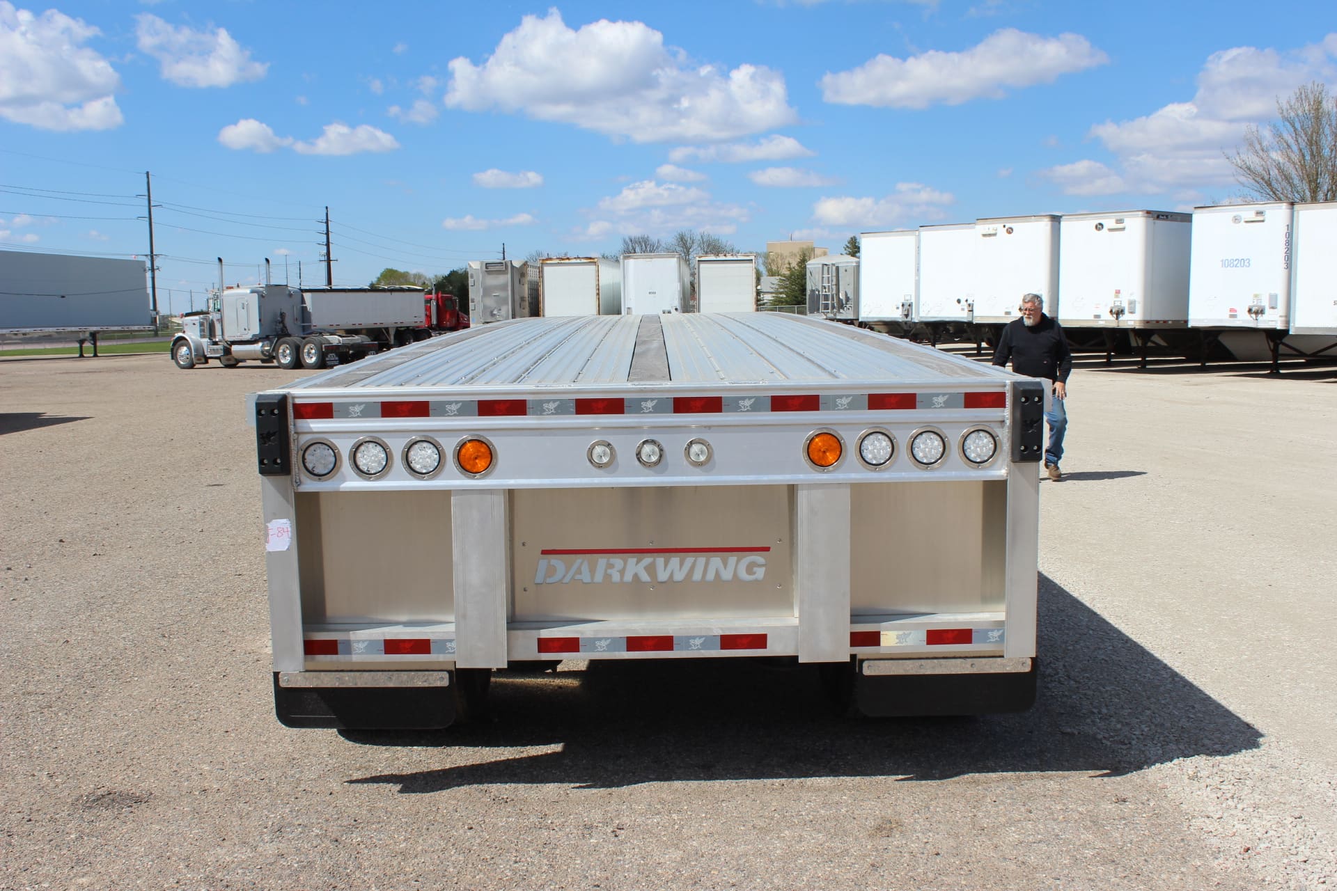 48’x102″ Aluminum flatbed, apitong floor, nail strips, sliding winch track with winches, 16″ crossmembers, coil package, 2 aluminum toolboxes, air ride suspension, spread axle with lifting front axle, disc brakes, tire inflation system, 11R22.5 aluminum disc wheels.