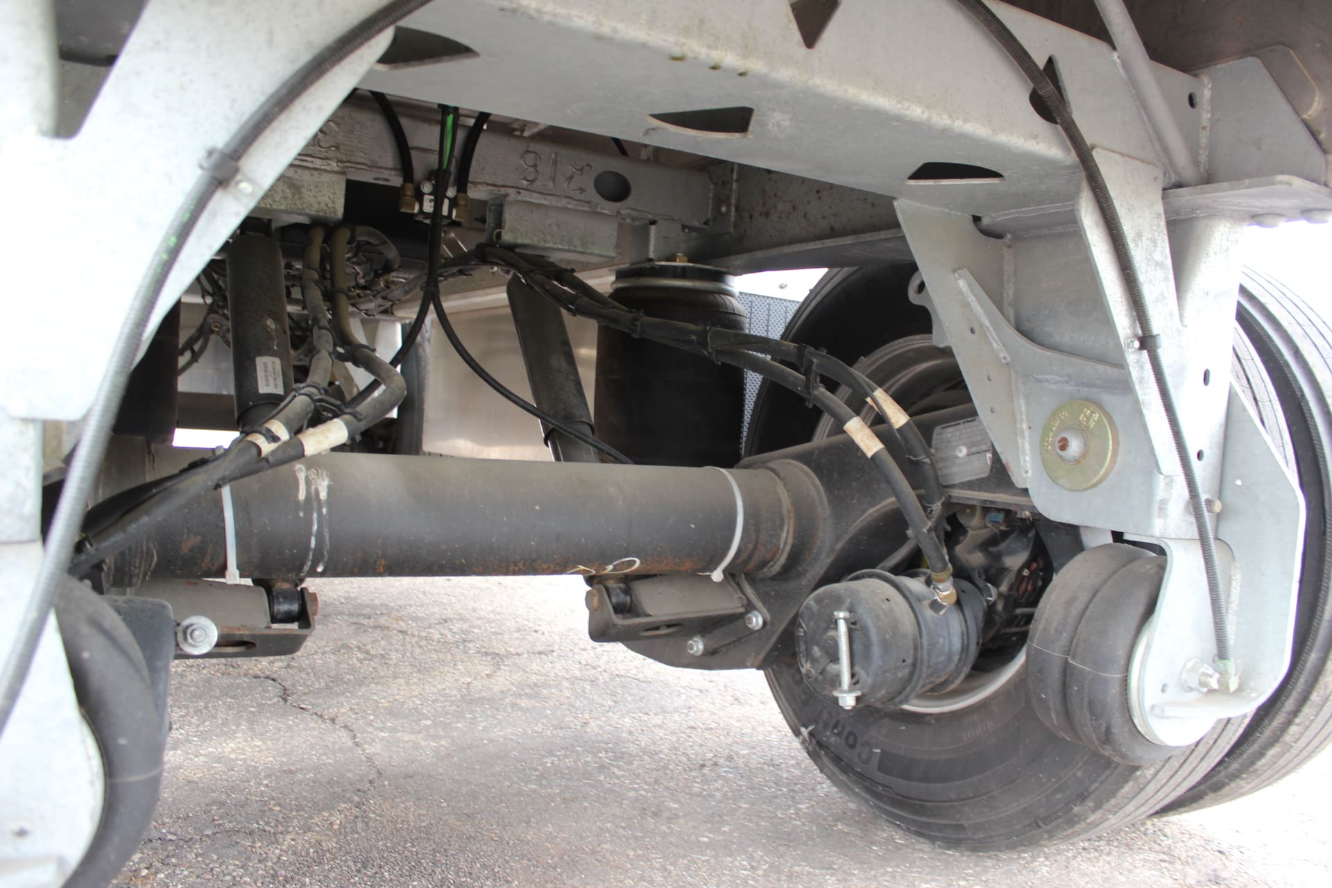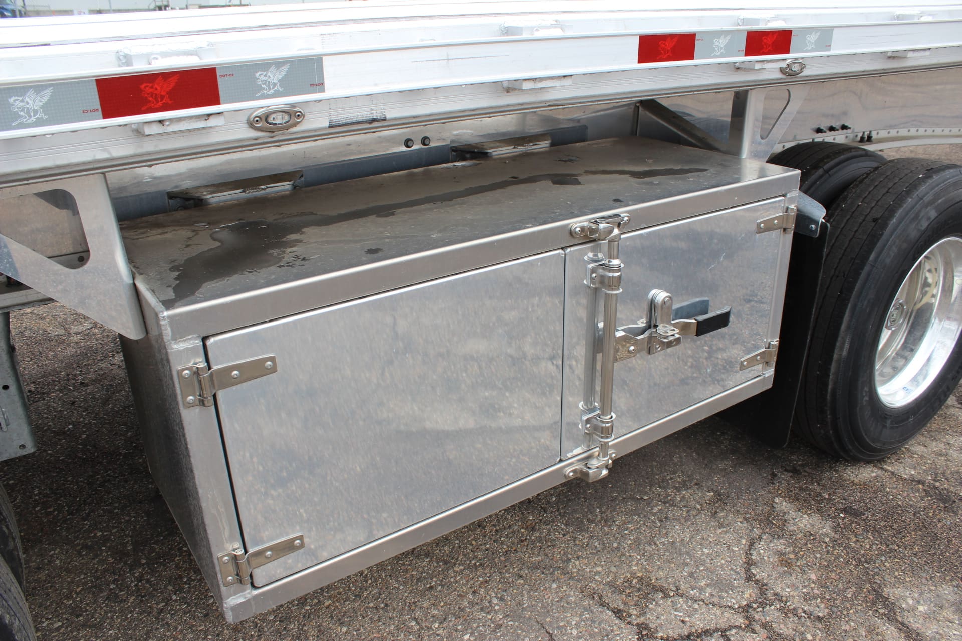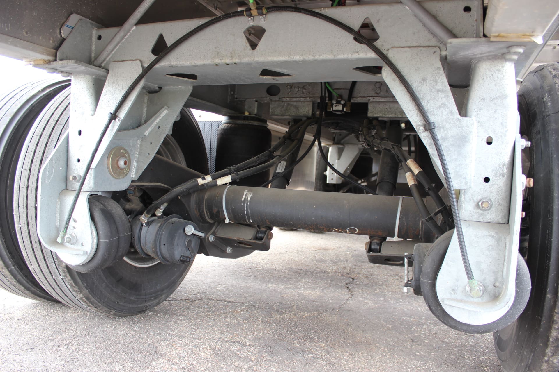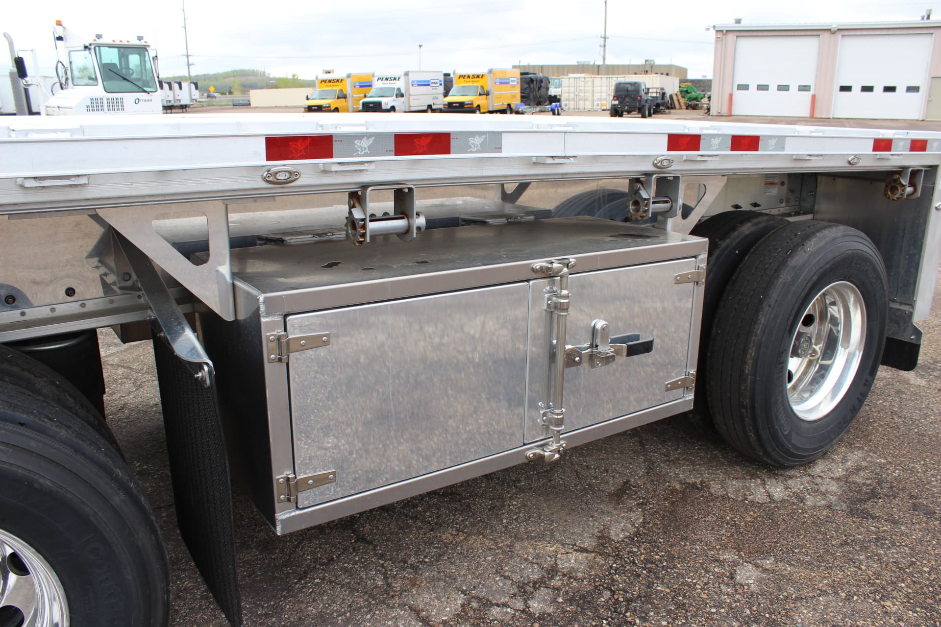 48’x102″ Aluminum flatbed, apitong floor, nail strips, sliding winch track with winches, 16″ crossmembers, coil package, 2 aluminum toolboxes, air ride suspension, spread axle with lifting front axle, disc brakes, tire inflation system, 11R22.5 aluminum disc wheels.