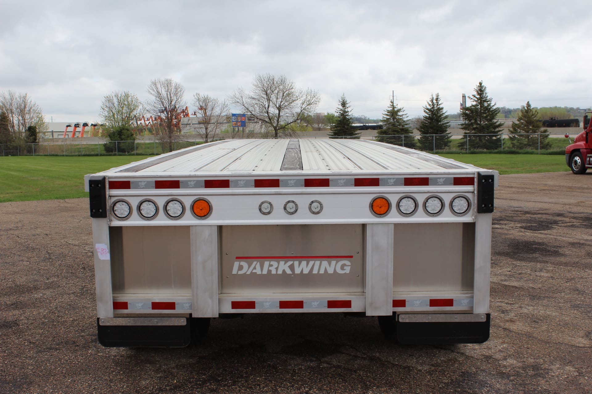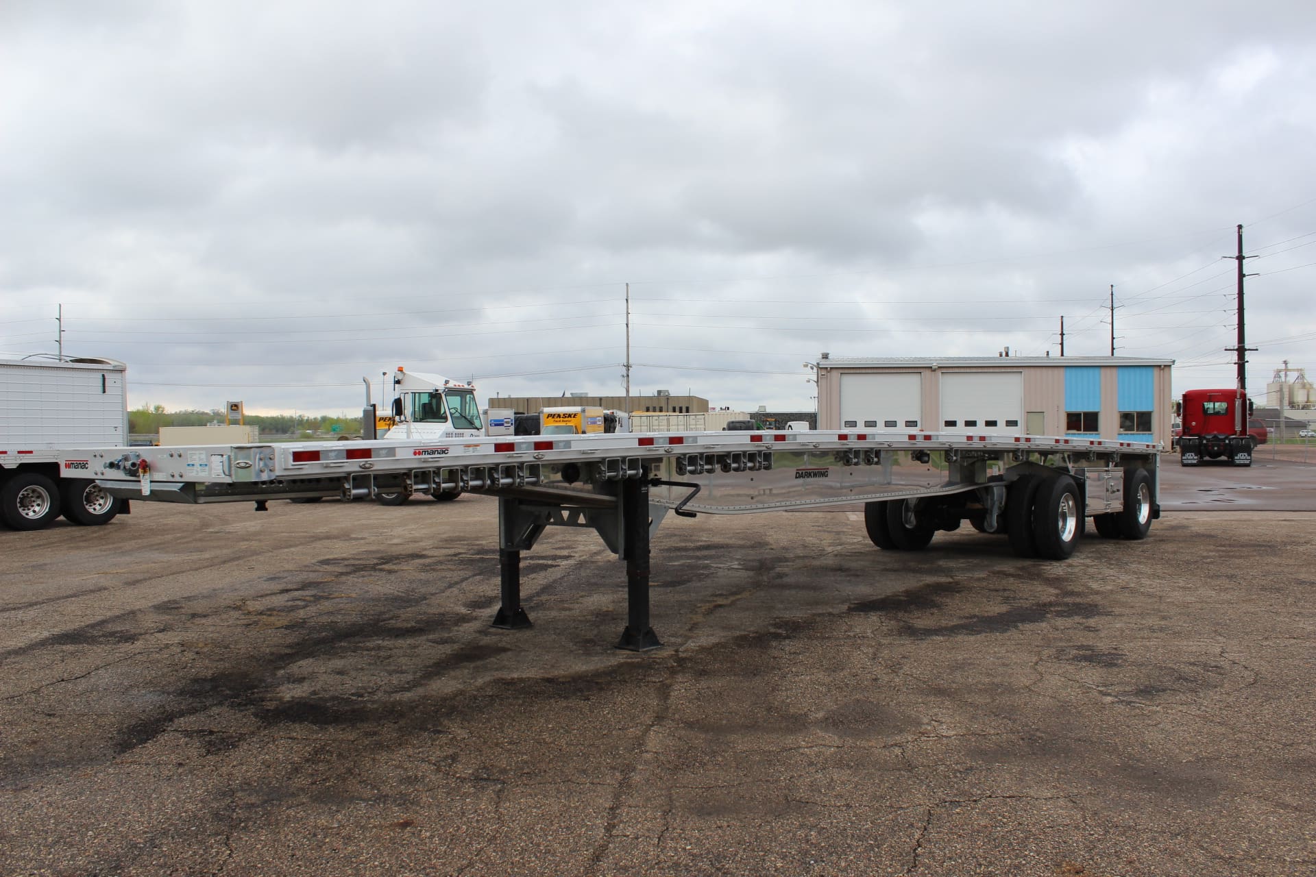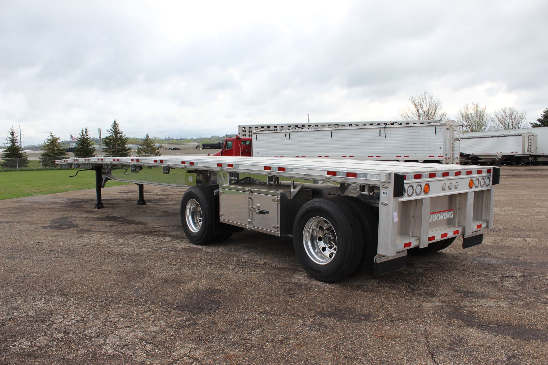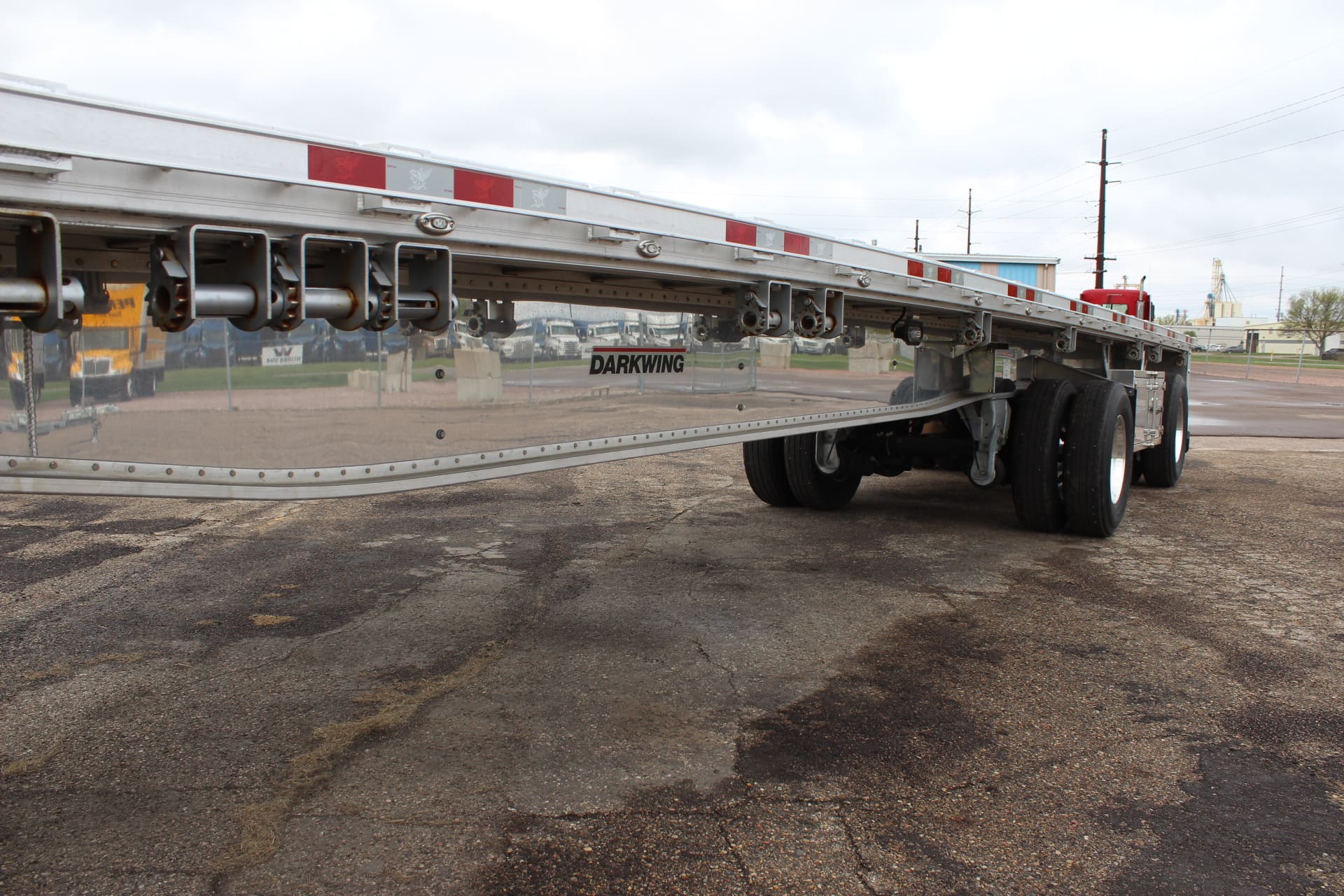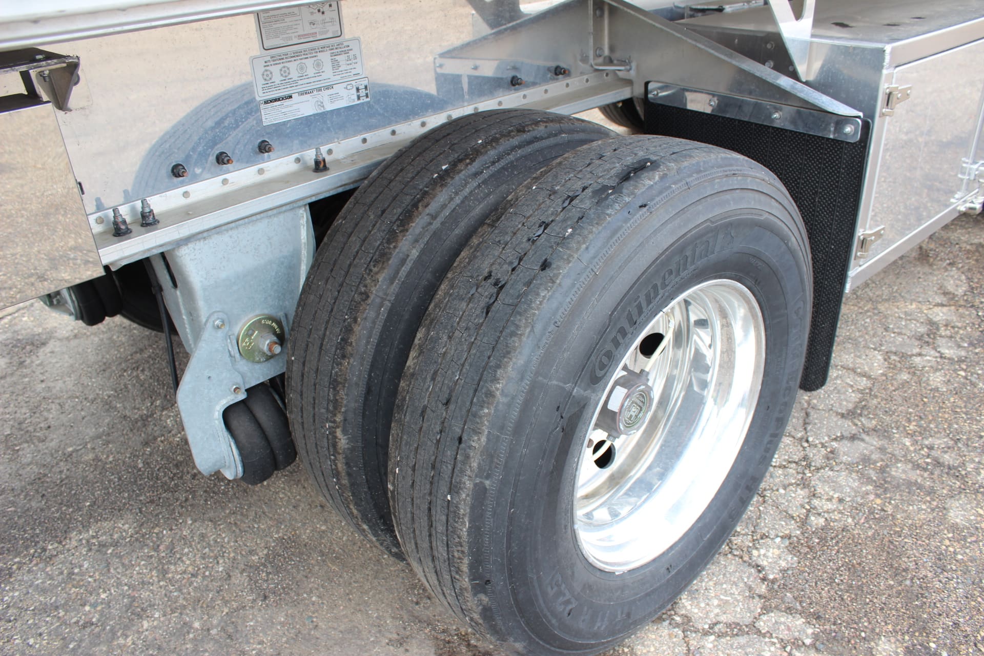 48’x102″ Aluminum flatbed, apitong floor, nail strips, sliding winch track with winches, 16″ crossmembers, coil package, 2 aluminum toolboxes, air ride suspension, spread axle with lifting front axle, disc brakes, tire inflation system, 11R22.5 aluminum disc wheels.